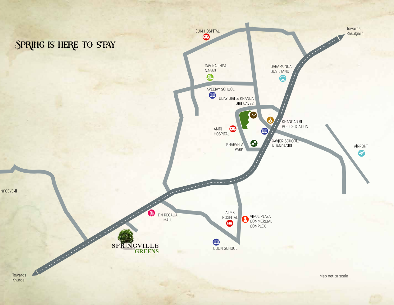 Springville Greens is located near DN Regalia Mall, with excellent connectivity to NH 16, key schools, hospitals, and city landmarks in Bhubaneswar.